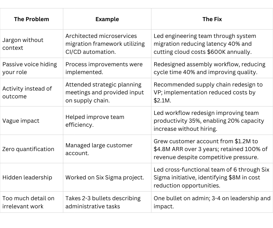 - Do bullets show leadership, influence, or strategic thinking—not just task completion?