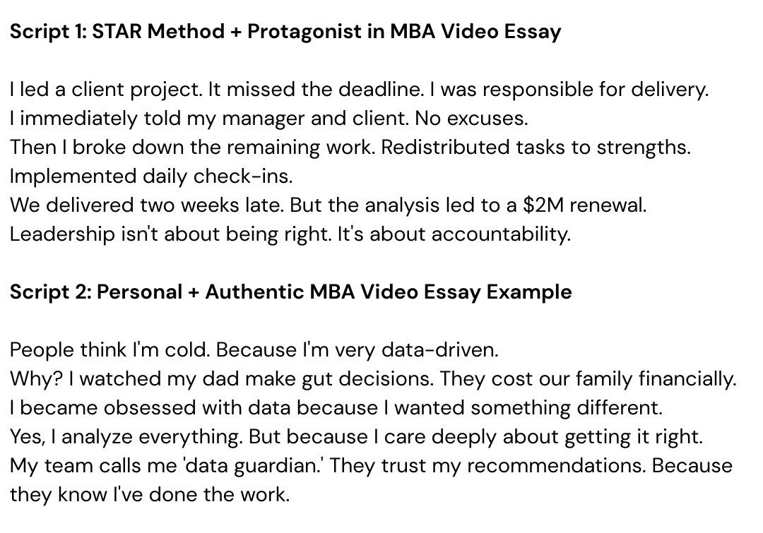The STAR and Numbers frameworks give you structure. The protagonist principle keeps you central. The authenticity mindset keeps you genuine. Together: A system for any MBA video essay question.