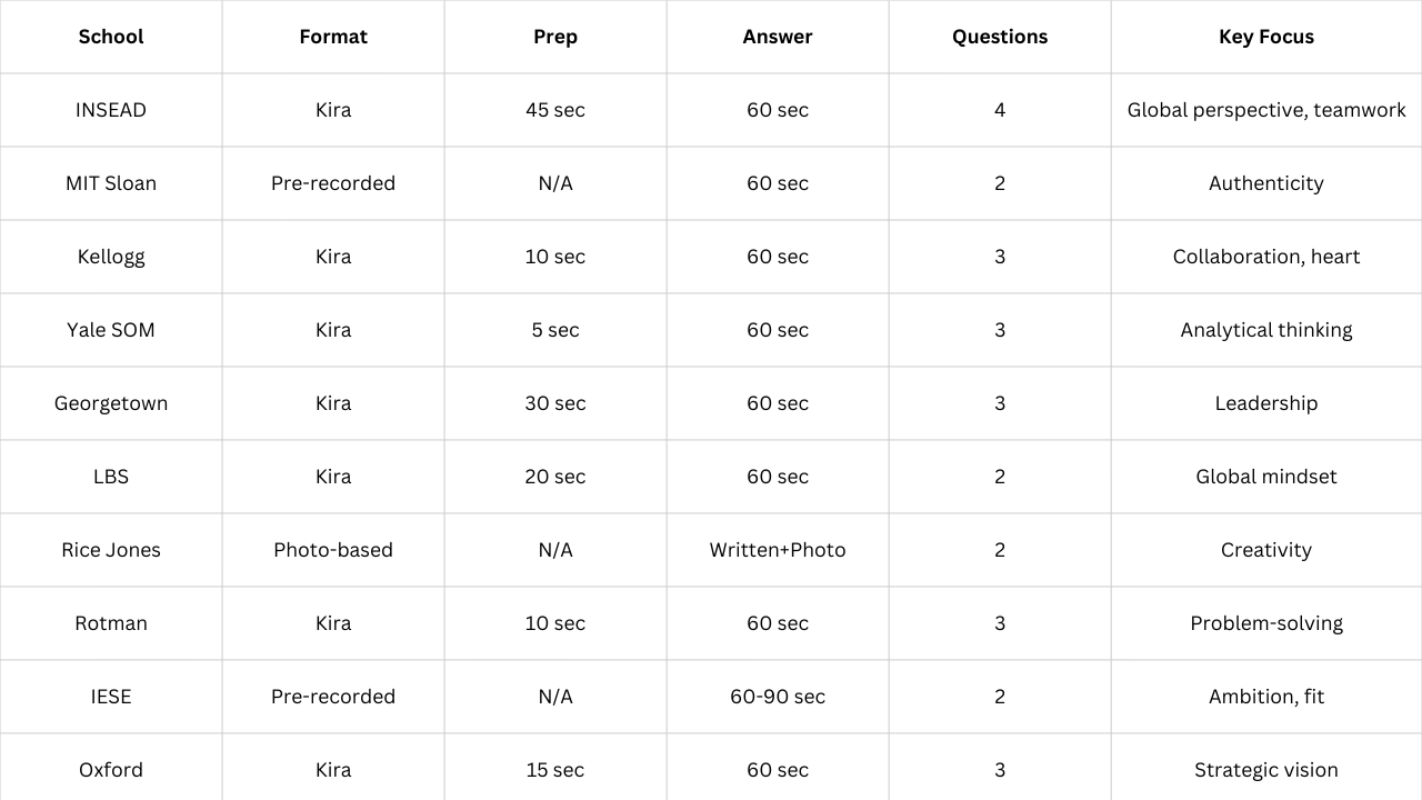 - Full mock MBA video essay sessions on Kira